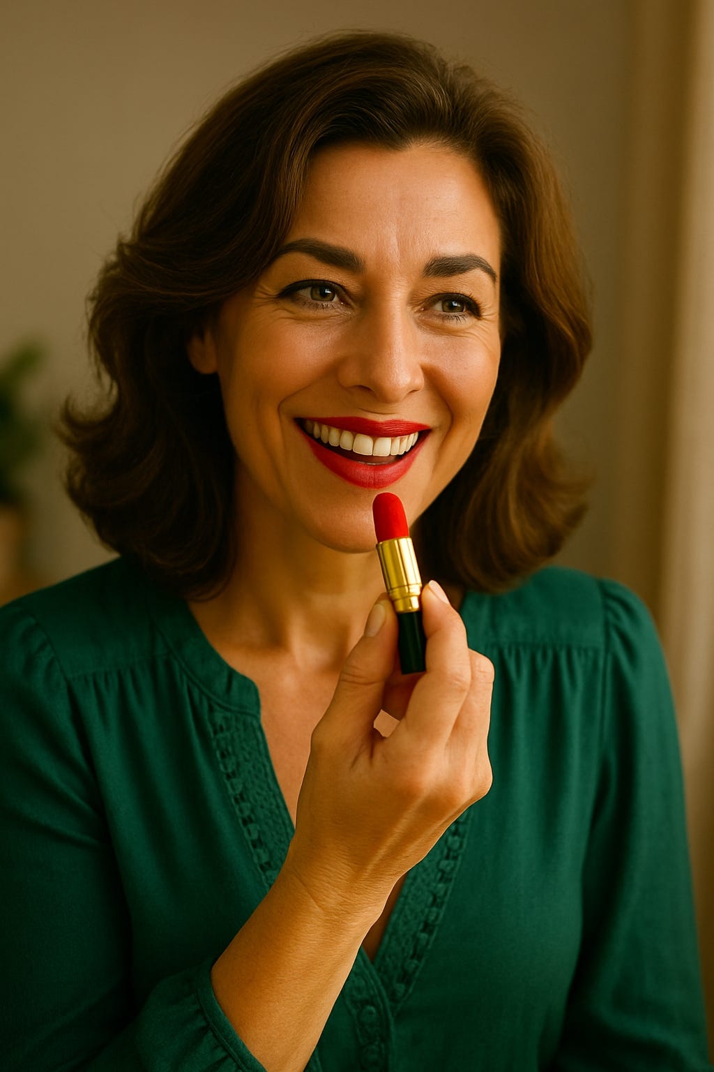 Joy stands at the bathroom mirror, drawing a line of bright lipstick across her lips. Raspberry red. A shade she hasn’t worn since she was twenty-seven.